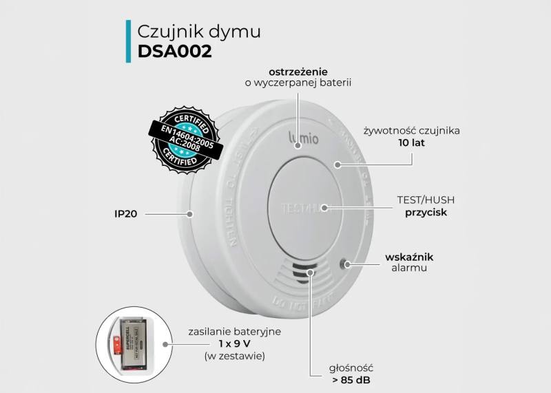 LUMIO DSA002 to certyfikowany czujnik dymu, spełniający normę EN 14604:2005+AC:2008. Urządzenie gwarantuje skuteczną ochronę przeciwpożarową przez cały okres użytkowania, ostrzegając w porę o zagrożeniu. To prosty i skuteczny sposób, by zadbać o bezpieczeństwo rodziny, mieszkania i mienia.