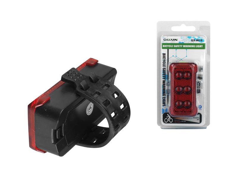 Lampa rowerowa tylna 6-LED zasilana dwoma bateriami typu AAA, zapewniająca jasne i widoczne światło, zwiększające bezpieczeństwo podczas jazdy rowerem w warunkach słabej widoczności.