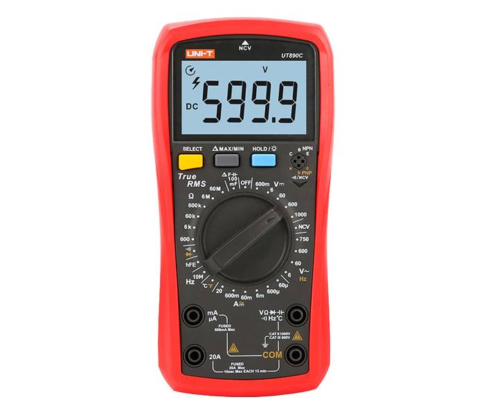 Wielofunkcyjny miernik prądu, napięciaUniwersalny multimetr pozwala zmierzyć napięcie stałe i przemienne, prąd stały i przemienny, rezystancję, temperaturę i pojemność oraz częstotliwość. Wyposażony m.in. w tester diod, test ciągłości obwodu, funkcję Hold , automatyczny wyłącznik oraz automatyczne podświetlenie. Uni-T UT890C