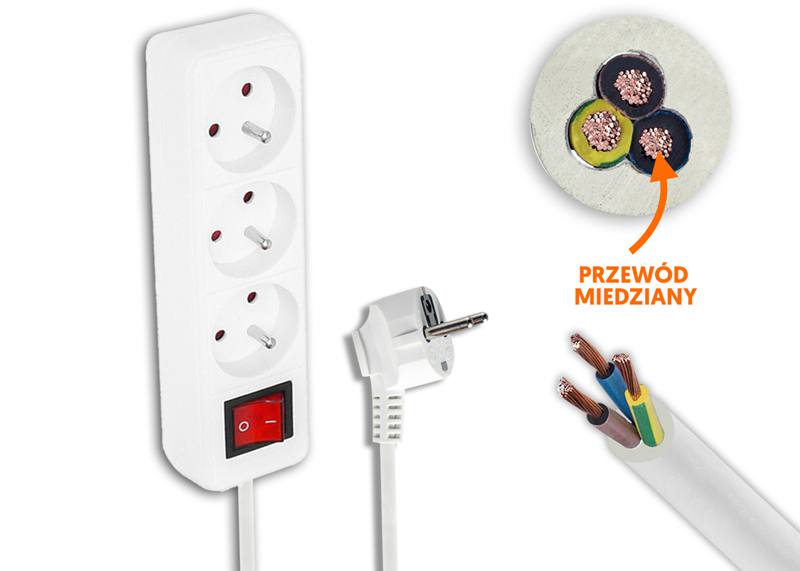Przedłużacz sieciowy 3 gniazda z uziemieniem i z włącznikiem 5m biały