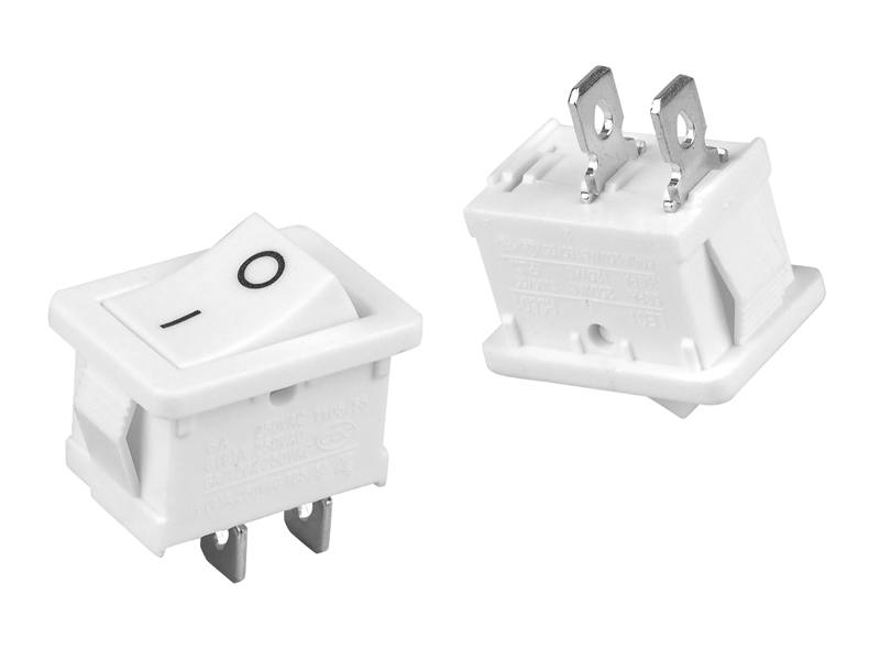 Prostokątny przełącznik wysokiej jakości, charakteryzujący się napięciem maksymalnym AC 250 V. Przełącznik dwupozycyjny ON-OFF. Obudowa w kolorze białym, wykonana z tworzywa sztucznego.