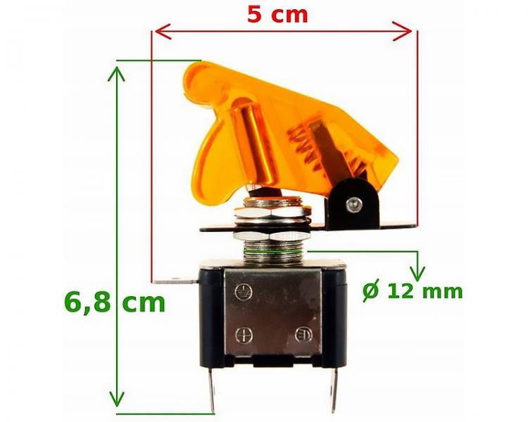 Wysokiej jakości przełącznik uniwersalny, z osłoną zabepieczającą przypadkowemu przełączeniu urządzenia.Przełącznik posiada wbudowaną diodę w kolorze obudowy.Wykonany z wysokiej jakości materiałów z pokrywą w kolorze pomarańczowym.