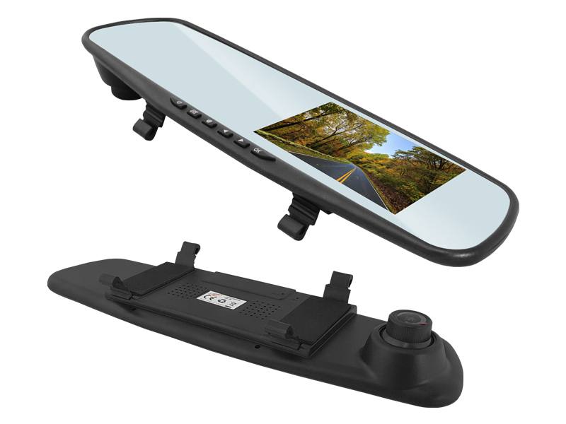 Duże lusterko wsteczne, które łączy w sobie wszystkie cechy niezbędne do bezpiecznej jazdy. Wbudowany wideorejestrator nagrywa zdarzenia na drodze rozgrywające się przed samochodem, a dodatkowa kamera cofania pomaga w parkowaniu. Rejestrator może być skonfigurowany do rozpoczęcia nagrywania wraz z włączeniem silnika. Dodatkowymi atutami są detekcja ruchu i sensor przeciążeń. Obie te funkcje zapewniają, że jeśli wydarzy się nieprzewidziana sytuacja to możemy mieć pewność, że zostanie ona zarejestrowna, a pliki będą bezpieczne. Pliki można nagrywać w pętli. Nowoczesna technologia podwójnego zapisu umożliwia nagrywanie zarówno z przodu jak i z tyłu pojazdu. Urządzenie obsługuje karty microSD do 32 GB.