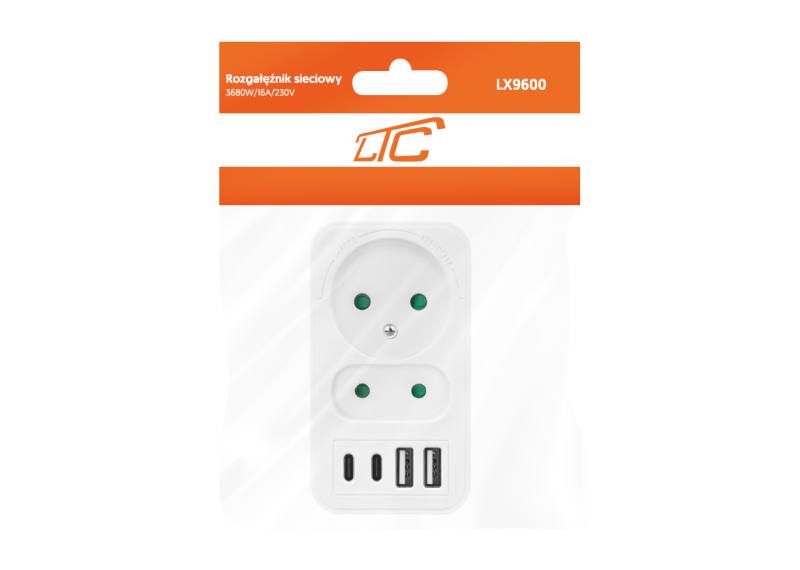 Rozgałęźnik LX9600 to praktyczne rozwiązanie dla każdego, kto potrzebuje jednocześnie zasilić kilka różnych urządzeń. Wyposażony jest w jedno gniazdo płaskie, idealne do sprzętów o mniejszym poborze mocy, takich jak lampki, ładowarki czy drobne akcesoria biurowe, oraz jedno gniazdo okrągłe z bolcem uziemiającym, przystosowane do urządzeń wymagających większej mocy – na przykład komputerów, ekspresów do kawy czy czajników elektrycznych. Dzięki temu rozgałęźnik pozwala bezpiecznie i wygodnie korzystać z różnych typów urządzeń w jednym miejscu.