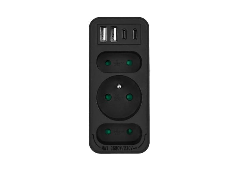 Rozgałęźnik sieciowy: 1 gniazdo okrągłe z uz.+ 2x gniazdo płaskie + 2x USB + 2x USB-C 3,1A Czarny