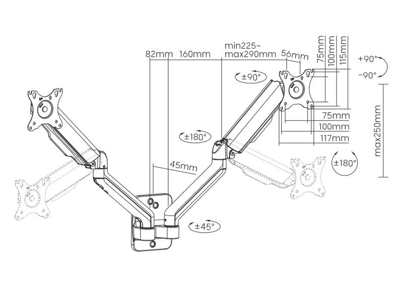 Ramię do monitorów Spacetronik oferuje pełną swobodę konfiguracji. Możliwość pochylenia w zakresie +90°~-90°, a zakres obrotu oraz rotacji ekranu to również +90°~-90°. Maksymalne wydłużenie ramienia to 450 mm, co umożliwia optymalne dostosowanie monitora do indywidualnych potrzeb użytkownika.