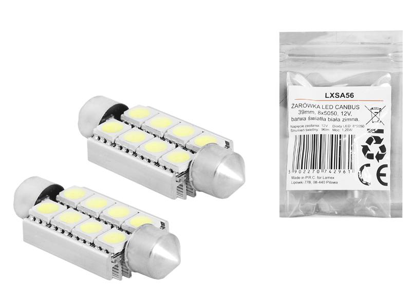 ŻARÓWKA LED CANBUS 39mm, 8x5050, 12V, barwa światła biała zimna.