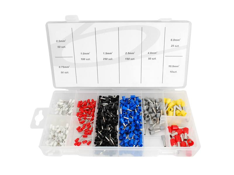 Zestaw tulejek do kabli elektr.685szt.Zestaw miedzianych końcówek i konektorów kablowych - 685 sztuk. Końcówki kablowe służą do łączenia kabli z urządzeniami elektrycznymi, innymi kablami, powierzchniami, itp.W skład zestawu wchodzi :50 sztuk końcówek do kabli 0,5 mm250 sztuk końcówek do kabli 0,75 mm2100 sztuk końcówek do kabli 1,0 mm2250 sztuk końcówek do kabli 1,5 mm2150 sztuk końcówek do kabli 2,5 mm250 sztuk końcówek do kabli 4,0 mm225 sztuk końcówek do kabli 6,0 mm210 sztuk końcówek do kabli 10,0 mm2